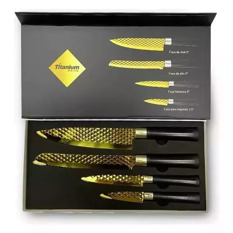 - 1 Jogo De Facas Deluxe Chef Aço Inox 4 Peças Titanium Gourmet