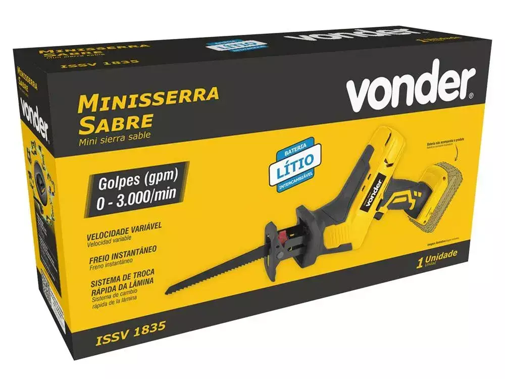 Este equipamento utiliza um modelo de bateria que pode ser intercambiável (não acompanha), ou seja, uma bateria que é compatível com outros modelos de ferramentas a bateria VONDER. Por isso, em sua próxima compra de ferramenta a bateria VONDER, procure um modelo que comece com a referência "I", ou que esteja identificado com o selo "Bateria Intercambiável VONDER". Desta forma, você garante modelos mais econômicos, sem a necessidade de aquisição de novas baterias e carregadores para uso em seu equipamento. Possui cabo com revestimento emborrachado, proporcionando maior conforto ao operador. Conta com velocidade variável, freio instantâneo e sistema de troca rápida da lâmina, não sendo necessário o uso de chaves.