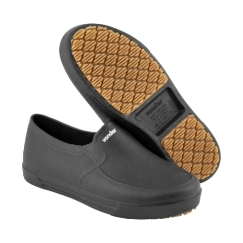 Conta com absorvedor de energia na área do salto, palmilha interna, solado de borracha antiderrapante resistente ao óleo combustível, ao escorregamento em piso cerâmico com solução de detergente e piso de aço com solução de glicerol.
